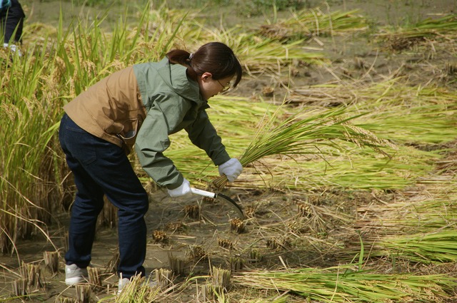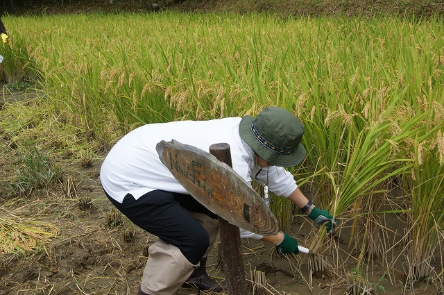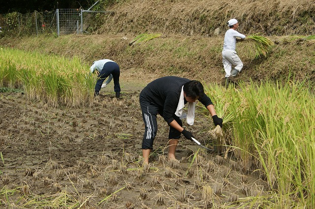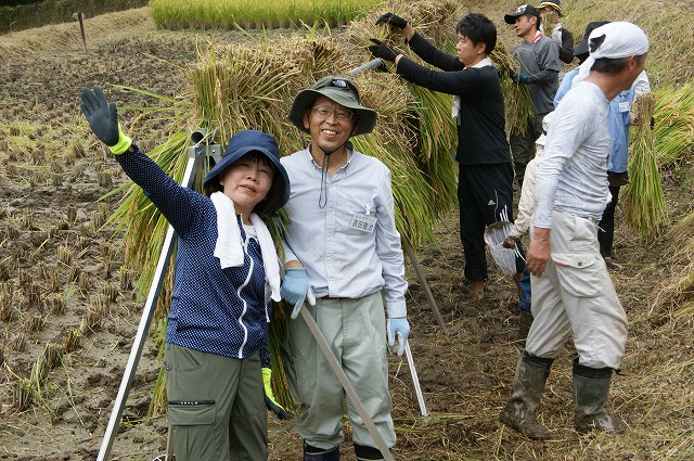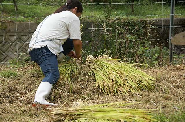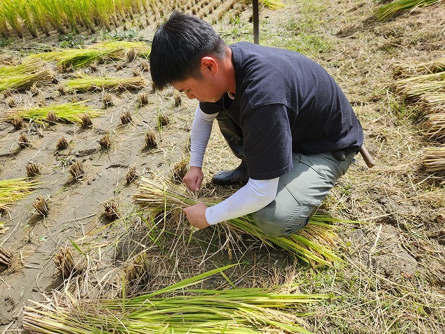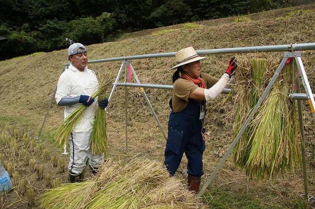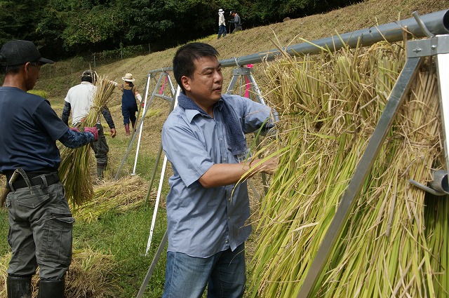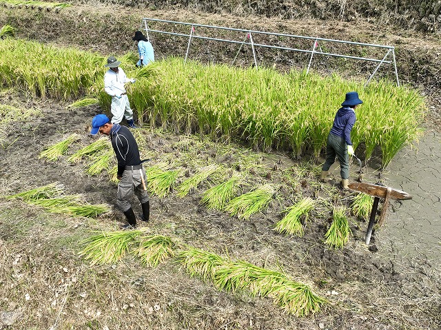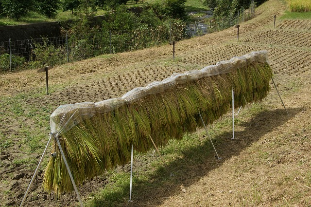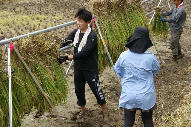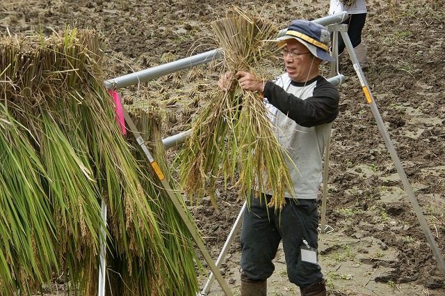 最近は田んぼでハデ干ししている所も少なくなりましたが、掛け方を聞きながら決められた場所に稲を掛けていきました。