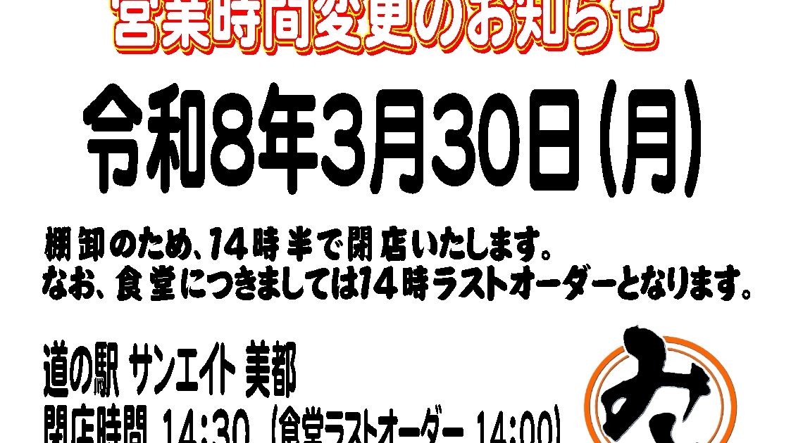 令和8年3月30日(月) 棚卸のため、 道の駅サンエイト美都は14:30で閉店いたします。 なお、食堂につきましては14:00がラストオーダーとなります。 ご迷惑をお掛けしますが、営業時間の確認の上ご来店をお願い致します・・・