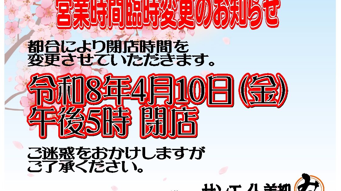 都合により令和8年4月10日(金)の閉店時間を変更いたします。