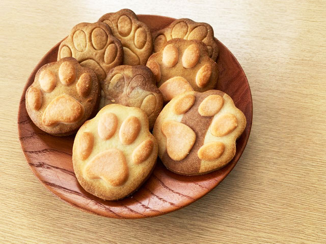 少し柔らかめなしっとりとしたクッキー生地で、ゆずとゆずみそ風味、ココアパウダー入りのマーブルクッキーの3種類が入っています。形は立体感ある石号の肉球をイメージした形と平面状の肉球の2種類です。